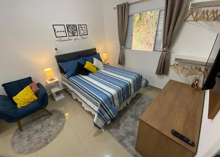 Para aproveitar as suas ferias em Cachoeira Paulista, fique no o Flat Recanto Novo Cn Cachoeira Paulista de 6 quartos, que está apenas 1.8 km da Faculdade Canção Nova e a uma distância de aproximadamente 15 minutos a pé do Santuário Diocesano de Santa Cabeça.